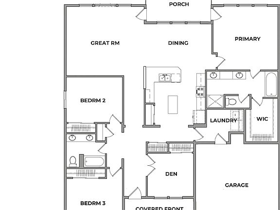 At 2046 square feet, the Stonefield 2046 Plan is an efficiently-designed, spacious single level home offering both space and comfort. The open kitchen is a chef’s dream, with a large island, plenty of cupboard storage and counter space. The expansive living room and adjoining dining area complete this eating and entertainment space, with the added appeal of a covered patio area off of the great room. The spacious and private main suite boasts a dual vanity bathroom with extra counter space, separate shower and soaking tub, plus an enormous closet. The other three sizable bedrooms, one of which can be converted into a den or office, share a second bathroom with dual vanities.