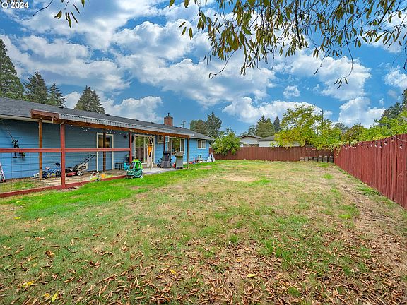 Spacious feeling home with large living room with fireplace w/pellet stove insert and dining room with slider to a big, fenced yard with a covered patio. Ceiling fans in most all rooms plus a wall a/c unit for comfortable living. Oversized garage and extra parking on both sides of the house. Conveniently located with easy access to schools, shopping and bus. Washer/dryer in garage not staying. Refrigerator is included.