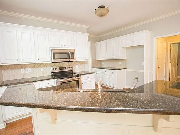 - Kitchen Features: Cabinets White, Breakfast Bar, Pantry, Breakfast Room, Eat-in Kitchen, Solid Surface Counters, Stone Counters, View to Family Room, Kitchen Island