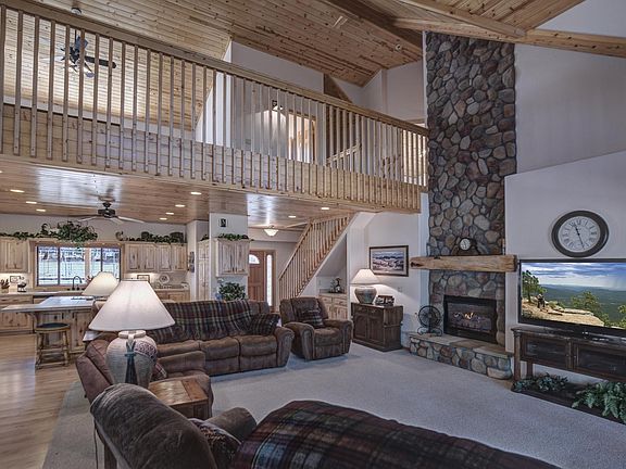 Bordering seasonal Pine Creek this lovely cedar-sided home features an open concept greatroom/kitchen/dining area anchored by a river rock faced gaslog fireplace, rustic T&G pine ceiling & sliding glass doors out to the spacious covered deck overlooking the tree-lined backyard. Chef's kitchen with hickory cabinets, tile counter counters & island breakfast bar, pantry, easy-care laminate floor. Spacious main level master bedroom with luxurious en-suite bath & fireplace, den/office, laundry, powder room. Upstairs is a loft game room & family room plus two nice-sized bedrooms each with a bath just steps away. Huge carport & concrete driveway parking. Kid & pet friendly level backyard shaded by mature sycamore trees. Sale includes vacant garden lot (.31 acre) across the street with well.