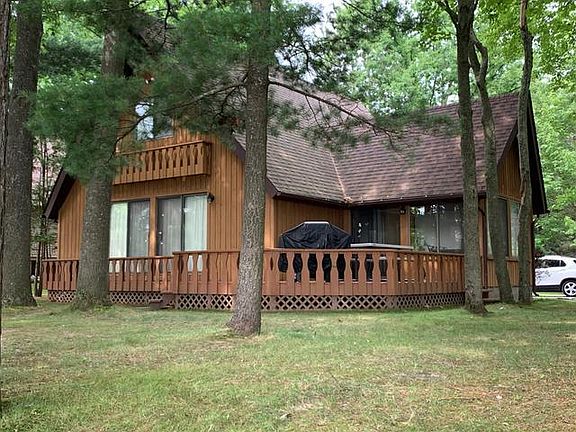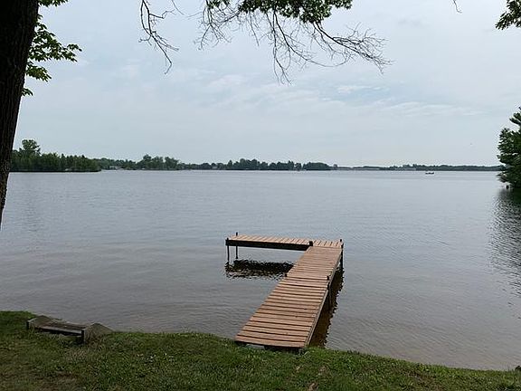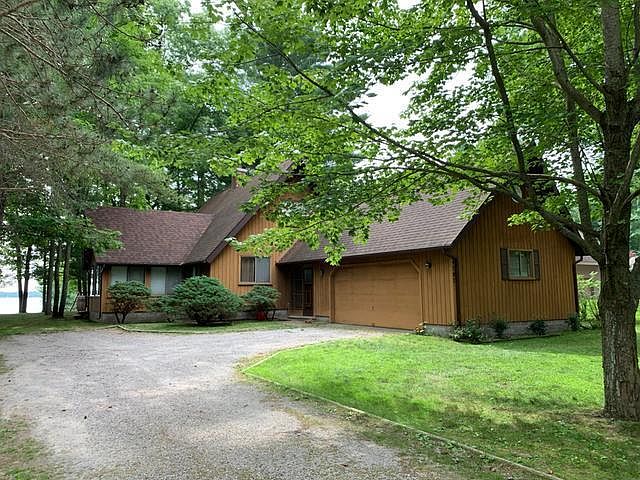 Looking for an almost perfect lot? This 3 bedroom, 2 bath Chalet sits on a beautiful park setting. Level sandy waterfront, perfect for swimming or inter tube, a swing you will probably sit in all day. Includes dock, tall shade trees, a dock and a full open view of main water on Lake Lancer. 85ft of water frontage on big lake, but set back away from speed boat traffic and a little under 1/2 acre for family to enjoy. This is a well maintained home that has an old country feel with antique looking hardwood floors (no Carpet), cozy gas fireplace for chilly evenings and conversations, open floor plan with 2 doorwalls that open to a wrap around deck with a fabulous view of waterfront. Main floor master, 2 full bedrooms up with full bath. Enclosed sunroom, new Forced air natural gas furnace, breezeway between the 2 car garage and home. Lots of storage. Perfect cottage, rental or full time home. Some furniture will stay. In time for summer use, occupancy to be April 1, 2020 or after.