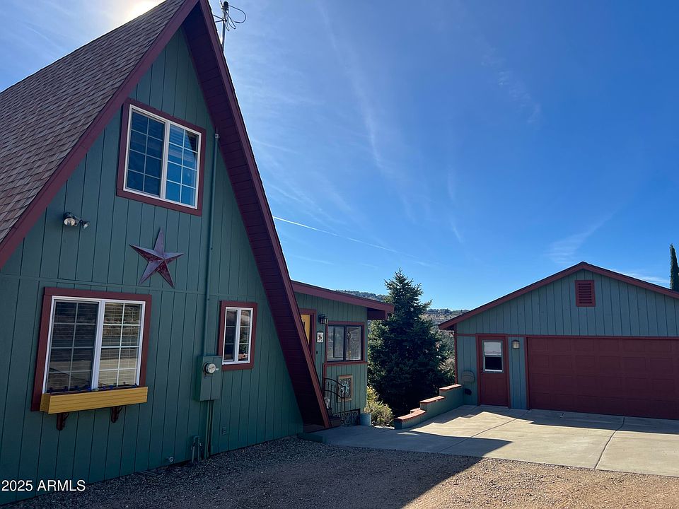 Perfect Mountain Retreat! An amazing opportunity for a second home, investment property, or your own cozy primary residence. This charming A-frame offers inviting living spaces w/ tongue & groove ceilings & stunning views through the dramatic wall of windows. The upgraded kitchen, dining area, primary bedroom, bathroom, & additional flex room are all located on the main level. Enjoy peaceful serenity or entertain your friends & family on the wrap around deck overlooking the mountain views. The upstairs loft provides a versatile space used as a 2nd bedroom or an office or creative retreat while also capturing those beautiful views. A detached 2-car garage sits just steps from the home & includes its own electrical panel, water heater & W/D. Large storage with concrete slab Don't miss your chance to own a charming escape in beautiful Prescott, conveniently located with easy access to shopping, dining, and medical services in Prescott or Prescott Valley.