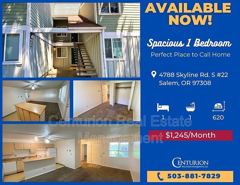 MUST READ MUST READ All Centurion Real Estate Management, LLC residents are enrolled in the Resident Benefits Package (RBP) for $50/month which includes renters insurance, HVAC air filter delivery (for applicable properties), credit building to help boost your credit score with timely rent payments, $1M Identity Protection, move-in concierge service making utility connection and home service setup a breeze during your move-in, our best-in-class resident rewards program, and much more! More details upon application. 1. Move-in Special ONLY applies to the current month. (IF APPLICABLE) 2. The application process normally takes 1-3 business days. 3. Must see the property physically before the deposit is made. 4. If you have a pet, ESA or you don't have a pet you must register at https crem.petscreening.com 5. Apply to one property at a time. Address: 4788 Skyline Rd S #22 Salem, OR 97306 Rent: $1,195+$50 RBP & Insurance=$1,245/mo Deposit: $1,200 (On Approved Credit) Application Fee: $68/per adult 18+ Tenancy: 1 Year Lease Bedrooms: 1 Bathrooms: 1 Sq. Ft: 620 Stories: 2-Story Building Complex Unit on: 2nd Floor Owner Paid Utilities: Water/Sewer/Garbage Tenant Paid Utilities: Tenants are responsible for Electric & Gas(If Applicable), and all other utilities Pet Policy: Pets are subject to approval and will require an additional deposit of $400/ pet, Pet rent may vary depending on Paw Score, Starting at $45 up to $100 per pet, 2 pets max 25lbs Ready Date (tentative): AVAILABLE NOW! Viewing Status: SCHEDULE A SELF VIEWING! Amenities Included: Fridge/Stove-Oven/Dishwasher Heat Type: Electric Laundry: Laundry On-Site Parking: Off-Street Parking Landscaping: Owner Responsibility Pet Policy: Notice to all residents and applicants, everyone must complete the screening process. This is not only for pet and animal owners; it applies to residents and applicants who do not own pets. The pet policy includes caged animals and pets. Additional deposits and monthly pet rents will vary; keep in mind that it is subject to the approval of your petscreening.com profile. You will not be moved into the unit without this completed. Prices are subject to change, we do not guarantee prices, items change, and errors occur. If there is a discrepancy between a price online and a price in the office, the supervising property manager shall have the final say. *Due to overwhelming demand we may be unable to respond to your rental inquiry. INTERESTED IN THIS PROPERTY? Properties are on a self-showing lockbox and each listing specifies how it is viewed. Feel free to drive by the property to check it out. "This information is deemed reliable, but not guaranteed." Centurion Real Estate Management, LLC 1365 Commercial St. SE Salem OR 97302