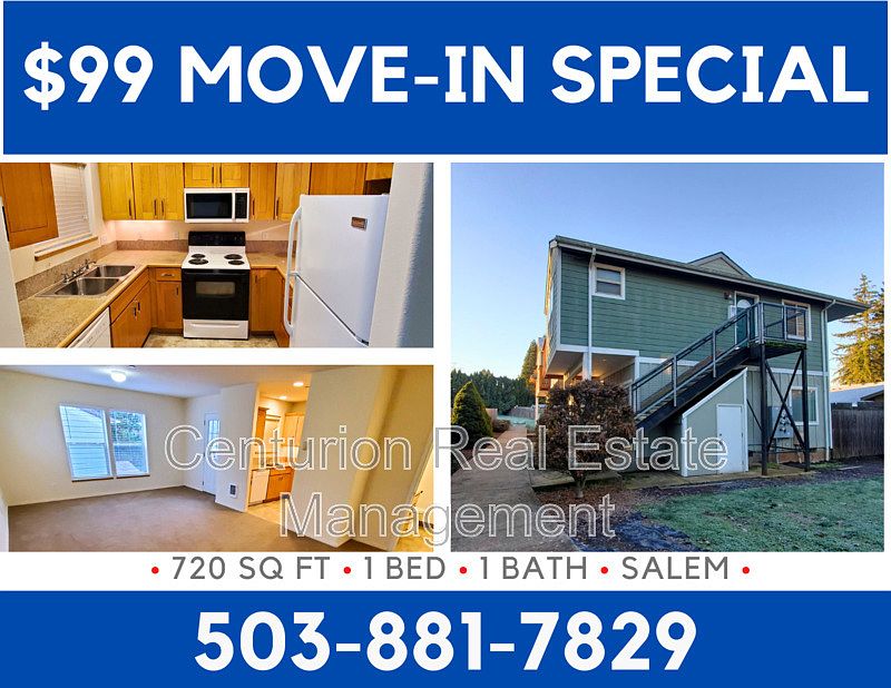 MUST READ MUST READ 1. Move-in Special ONLY applies to the current month. 2. The application process normally takes 1-3 business days. 3. Must see the property physically before the deposit is made. 4. If you have a pet, ESA or you don't have a pet you must register at https crem.petscreening.com 5. Apply to one property at a time. PLEASE READ, $995 FOR THE FIRST 3 MONTHS AND $1,095 THEREAFTER FOR THE REMAINING TERM OF THE LEASE. FYI, YOU MUST STILL MAKE 3 TIMES THE REGULAR RENT OF $1,095 IN ORDER TO INCOME QUALIFY Address: 4788 Skyline Rd. S #44 Salem, OR 97306 Property Type: Apartment Rent: $1,095/MO Deposit: $1,000 (On Approved Credit) Application Fee: $68/ per adult 18+ Tenancy: 1 Year Lease Bedrooms: 1 Bathrooms: 1 Sq. Ft: 720 Owner Paid Utilities: Water, Sewage, Garbage Tenant Paid Utilities: Tenant is Responsible for Electric, Gas (If Applicable), And all Other Utilities Pet Policy: Pets are subject to approval and will require: Additional deposit of $400/ pet, Pet rent may vary depending on Paw Score, Starting at $45 up to $100 per pet, 2 pets max 25lbs Ready Date (tentative): AVAILABLE NOW! Viewing Status: Call the number on ad to Schedule Viewing! Amenities Included: Fridge Stove/Oven Heat Type: Electric Floor of Unit: 2nd Laundry: Laundry On-Site Parking: Off-Street Parking Landscaping: Owner Responsibility Pet Policy: Notice to all residents and applicants, everyone must complete the screening process. This is not only for pet and animal owners; it applies to residents and applicants who do not own pets. The pet policy includes caged animals and pets. Additional deposits and monthly pet rents will vary; keep in mind that it is subject to the approval of your petscreening.com profile. You will not be moved into the unit without this completed. Prices are subject to change, we do not guarantee prices, items change, and errors occur. If there is a discrepancy between a price online and a price in the office, supervising property manager shall have the final say. *Due to overwhelming demand we may be unable to respond to your rental inquiry. INTERESTED IN THIS PROPERTY? Properties are on a self-showing lockbox and each listing specifies how it is viewed. Feel free to drive by the property to check it out. "This information is deemed reliable, but not guaranteed." Centurion Real Estate Management, LLC 1365 Commercial St. SE Salem OR 97302