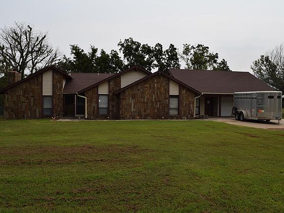 Put this at the top of your list of homes to see! Entrance, kitchen and dining room have hardwood floors. There's new carpet, fresh paint, new appliances, 2 living areas plus a sunroom. Both living areas are large and one has a wood burning fireplace. Step outdoors and enjoy the large stocked pond, beautiful trees (lot of them are pecan trees AND a 1600 sq. ft. workshop/outbuilding on concrete slab with two 10 ft. garage doors and 1/2 bath. Make your appointment today!