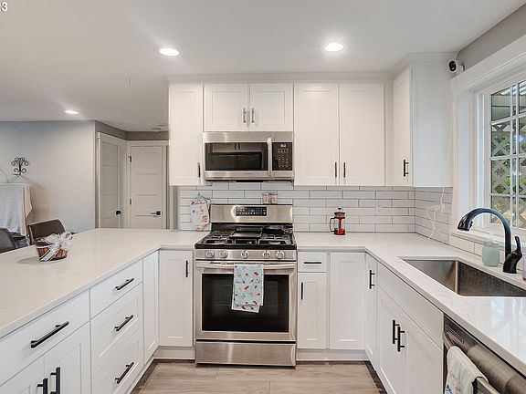 This completely renovated home on 1/3 of an acre was tastefully updated from top to bottom in 2021. Open floor plan with laminate flooring throughout, vinyl windows & a ductless heat pump. Kitchen features include quartz counters, extensive cabinetry, gas range, coffee bar, stainless steel appliances & a breakfast bar with stools. Primary suite has two closets, double sinks & a walk-in shower. Nice separation of space with the two bedrooms & bathroom on the other side of the house. Formal dining room works well for additional living space or a home office. Stackable washer & dryer and the stainless steel refrigerator are included in the sale. The large yard is fenced with raised garden beds, storage shed & room for all of your toys. Potential for an ADU or additional building lot. Buyer to do their own due diligence. Schedule your showing today!