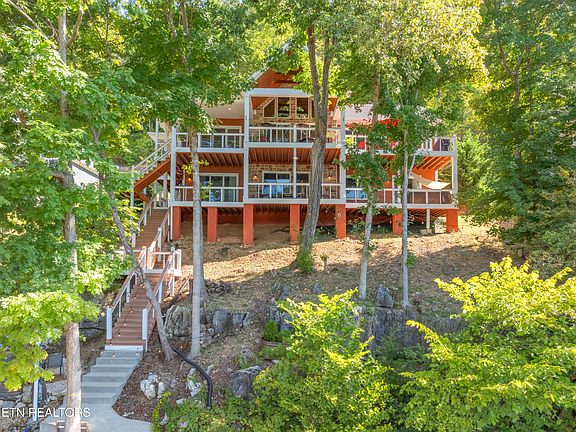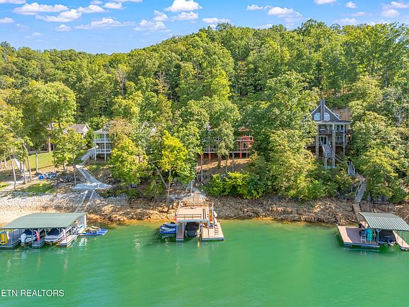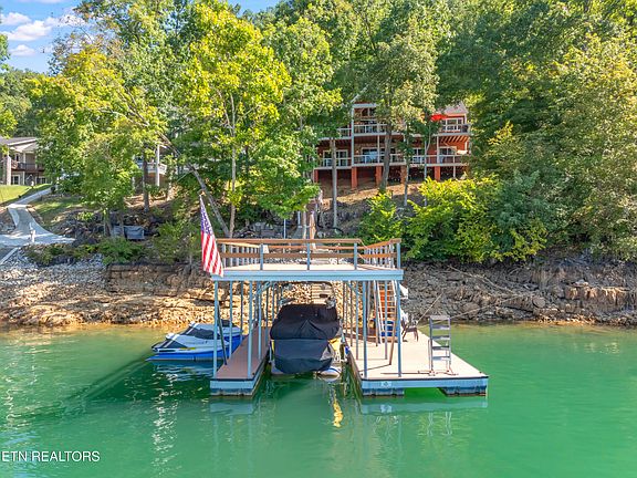 Welcome to your dream oasis! This stunning custom-built 3-bedroom, 4-bath home offers an incredible 4,108 square feet of living space, perfectly designed for comfort and luxury. Ideal for versatile living, the property includes three additional rooms that can be adapted for sleeping, a home office, or a personal workout space. Nestled on the main channel, this basement/ranch-style residence provides breathtaking panoramic views of the lake, making every moment truly special. Step inside to discover an open-concept main floor that showcases soaring vaulted ceilings adorned with rustic wood beams and a magnificent wall of windows that floods the space with natural light. The floor-to-ceiling stone gas fireplace serves as a stunning centerpiece, exuding elegance and warmth. Culinary enthusiasts will fall in love with the gourmet kitchen, featuring high-end stainless steel appliances, a gas range, a charming farm sink, a spacious walk-in pantry, and a large center island—perfect for both cooking and entertaining. Retreat to the main level's serene master suite, boasting a spa-inspired bathroom and private access to outdoor areas. An additional full bathroom is conveniently located just steps away from a spacious bonus room. Venture downstairs to find an expansive rec-room/family area equipped with surround sound—ideal for relaxation and entertainment alike. You will find a second master bedroom, another bedroom, two additional versatile rooms, and a full bath. The basement also houses a well-placed laundry room for added convenience. Outside, enjoy ample outdoor living space with easy access to the lake via just 38 steps at full pool. The beautifully crafted double-decker dock features a boat lift and three jet ski ports, ensuring that your water adventures are always within reach. The oversized garage provides generous storage options, while multiple outdoor areas let you fully appreciate the stunning surroundings. The covered upper deck, extending nearly the entire length of the house, offers a perfect vantage point to soak in the picturesque views, while the lower deck invites you to unwind in the hot tub, surrounded by nature's beauty. Don't miss this exceptional opportunity to own a piece of paradise! Your lakeside retreat awaits.