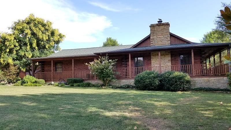 Beautiful well built solid cedar log home situated on approx 32+/- acres. Approx 25 acres are in open pasture and 6 acres in timber. All acreage is fenced and cross fenced. (Livestock corral and panel system does not convey with home.) The yard is approx an acre. Pasture has year round spring fed pond for livestock. There is an on site well with great water for livestock, with the home being on rural water. Home has open floor plan with vaulted great room, with beautiful and very efficient stone fireplace. 3 bedrooms, 2 baths, all bedrooms with walk-in closets, hall linen closet, mudroom with pantry and separate broom closet. A portion of the porch has been enclosed for 4 season room, with central heat & air, that provides year round enjoyment of the surroundings. Ceiling fans are throughout home. Dining room lighting is an Urban Forge (formally known as Ironworks) design from local artisans, as well as the kitchen, mudroom, and master bath cabinet and drawer knobs. Master bath towel holders and tissue holder are also Urban Forge (Ironworks) products, and convey with home. Great room sconces do not convey. Wood burning fireplace has Urban Forge (Ironworks) design trim as well. Inside of home is pet free and smoke free. Garage is a 1200 sq. ft. 2 car garage that also serves as a farm shop. Garage is detached, but there is a covered breezeway between the house and the garage. Storm shelter closely located to the back porch. Established muscadine vines in the yard, along with peach and apple trees, and a good garden spot. Wonderful setting for a hobby farm, but still close to town.