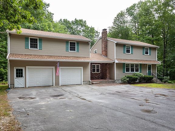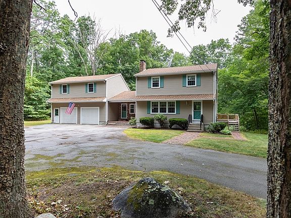 One owner Colonial set off the road with great privacy. Pride of ownership shows here. Steel beamed oversized garage with plenty of space for "Man Town" above.Enter through the family room with has duel heat of oil and electric and sliders to a rear deck and plenty of privacy. All newer windows. Brand new kitchen with quartz and stainless steel appliances. New upgraded cabinets by Uxbridge Cabinets and plenty of recessed lights. Renovated first floor half bath. A beautiful stone fireplace adorns the large living. All brand new hardwood flooring on first floor and upstairs hall way. Three bedrooms upstairs with plenty of large closet space. Renovated full bath. Central Air. Small second deck off of the kitchen. Additional partially finished family room with fireplace in basement. Walk out basement. There is truly nothing that needs to be done other than move in!!. Double wide driveway with plenty of extra parking. This home will not last long.brand new garage doors installed.