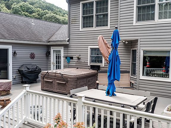 The fully finished basement offers additional living space with two bedrooms and a 3/4 bath, and small office. The expansive deck and hot tub create an outdoor oasis, ideal for hosting gatherings or unwinding after a long day. Upgrades include Trex decking and hardwired lighting.