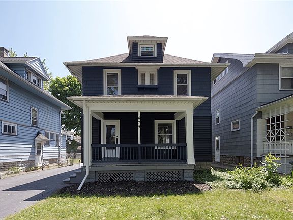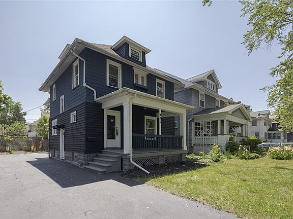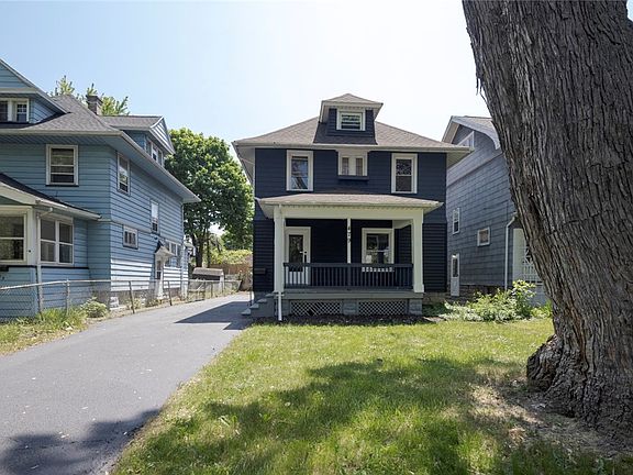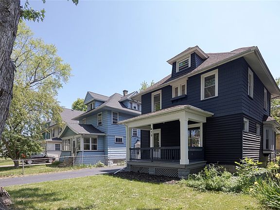 This striking, freshly painted inside & out nearly 1600 square feet, 3/4 bed, 1.5 bath colonial in the Historic Maplewood District is finally available for a new owner! Featuring: Inviting open porch, NEW laminate & wall-to-wall carpet, refinished hardwood floors, NEW kitchen cabinets with modern color, walk-in pantry, dishwasher & gas oven included NEW butcher block countertops in the kitchen, new lights fixtures throughout, spacious formal dining room w/beutiful pocket doors, large living room w/ decorative fireplace, thermopane & leaded glass windows, 1st-floor private office, the upper-level boasts an UPDATED full bath w/ tile surround & niche, 3 bedrooms, sleeping porch, built-in linen closet, fully finished attic enters from the hall & possible 4th bedroom, virtually maintenance free yard, Newer roof & hot water tank '23, NEW electric service & panel, maintenance-free vinyl siding. The neighborhood of sidewalk/street light-lined streets makes it a very walkable location & convenient to the expressway, parks, walking/running trails, shopping, entertainment, Kodak Center, Downtown, & airport. Delayed negotiations: Offers due Wednesday 6/7/23 @3pm w/ a 24-hour life of offer.
