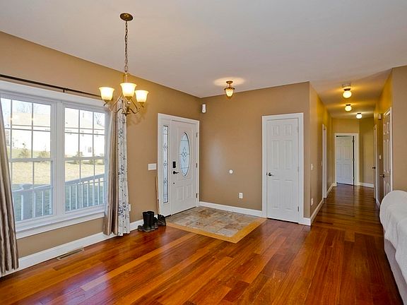 Welcome to this stunning 4-bedroom ranch nestled on over 3 acres. Step inside to discover an inviting open floor plan flooded with natural lighting and 9-foot ceilings. The expansive living room showcases a cozy gas fireplace and direct access to the rear deck. The kitchen boasts granite countertops, cherry cabinets, and stainless steel appliances. Adjacent, a first-floor laundry, half bath, and a bedroom offer convenience. The primary suite indulges with dual closets, including a walk-in, a luxurious bath with a soaking tub, separate showers, and a double vanity. Two more bedrooms share access to a full bath. The basement hosts a partially finished area with a half bath—perfect for an office, extra living space or in-law space. Handicap features include a covered entrance ramp, electric door, and wide doors to enhance accessibility. Don’t miss out on this unique home. Audio and video surveillance on the premises. Schedule your showing today!