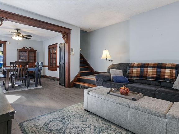 **Welcome Home!** Step into this charming 1913 cedar sided twin home, where historic character meets modern comfort. Upon your arrival, the inviting covered front porch welcomes you in, complete with a cozy vestibule to stash shoes and coats. Inside, the living room features elegant arched details and wood-framed windows with updated blinds, creating a warm and welcoming space. Upstairs, you’ll find three generously sized bedrooms with large, deep closets offering plenty of storage. The newly updated bathroom boasts a tiled tub/shower combo, stylish honeycomb floor tiles with eye-catching gold grout, and a stunning gold sink faucet. For even more potential space, head up to the semi-finished fourth room – potential for a home office, storage, or even another bedroom. Back on the main level, the dining room delights with a built-in hutch, charming chair rail, and bump-out nook perfect for memorable meals. Don’t miss the beautiful stained-glass window, adding a touch of vintage artistry. The brand-new kitchen will surprise and impress you with its stainless GE appliances, glass wall tiles, and sleek quartz countertops. A black stainless sink adds a modern twist. Step outside to your partially fenced backyard with a new composite deck, complete with a privacy wall to create your own relaxing outdoor retreat. In the rear of the yard, you’ll find an oversized one-car garage with storage space and a tool bench. Extra perks include a new hot water heater in 2021, updated kitchen and bath in 2023, and a new composite deck in 2024. The full, unfinished basement with shelving provides for additional storage. All of this is located within walking distance to town, with shopping at the Garden Farm Market and more right at your doorstep. This incredible home can be yours!