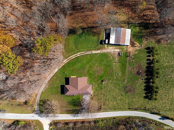 Nestled on over 5 picturesque acres with woods plus fenced pasture, this beautifully renovated 4-bedroom, 2.5-bath home offers a perfect blend of country living & modern convenience. The large 576 sq. ft. game/tv room with a separate entrance, laundry, & 1/2 bathroom provides versatile options for an in-law suite, rental, or home office. Entertain in the light-filled dining room with rich hardwood floors, and cook in the updated kitchen boasting hickory cabinets, quartz countertops, & stainless steel appliances. Step into the adjacent cozy living room with gas fireplace framed by brick masonry. The primary suite includes a walk-in closet and a luxurious en-suite bath with a soaking tub, dual sinks, & a walk-in ceramic-tiled shower. Three additional beds & a full bath complete the main floor. The unfinished basement is dry & perfect for storage. Step outside to enjoy the expansive covered back porch overlooking this beautiful property. A large barn with 6 indoor stalls, water, electric, workshop space, & storage provides ample room for homesteading or hobby farming. Enjoy the convenience of free natural gas for heating, hot water, and cooking. Additional updates include recently replaced front and back roofs, new carpeting, newer water heater, and new gas range and microwave. Ideally located just 15 minutes from IU’s campus, near Unionville Elementary School & Lake Lemon, this property offers convenience & rural charm.
