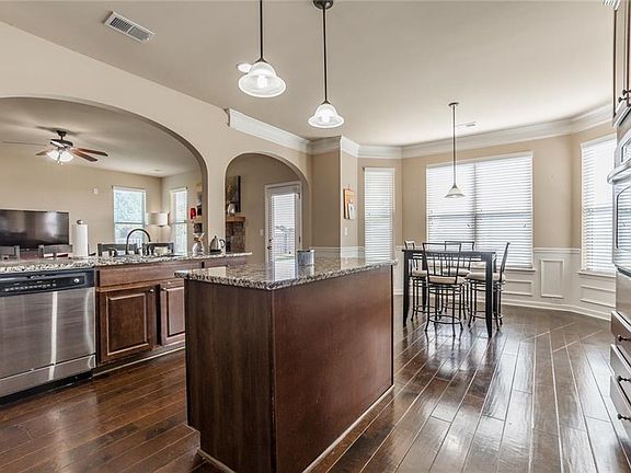 Gorgeous move in ready home! Great neighborhood, location and top schools! Beautiful upgrades that include a lrg welcoming open floorplan, arched doorways, hardwood floors, lovely eat in chefs kitchen that includes an island, granite, ss appliances, breakfast bar w/views into the family rm w/fireplace & dining rm. Welcoming covered patio to enjoy off kitchen. Upstairs boasts a very lrg owners suite complete w/walk in closet, double vanities, soaking tub & tiled shower. 3 add'l spacious bdms, laundry rm ,full bath & loft area. Home sits on a beautiful flat lot.