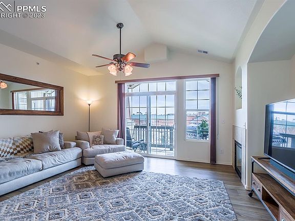 This beautiful turn-key 2 bed, 2 bath unit is awaiting a new owner. This home is located on the third floor with only stair access (no elevator). Each bedroom lies on opposing ends of the unit offering wonderful privacy or a great setup for roommates / guests. Each spacious bedroom also comes complete with full-size ensuite bathrooms. One of the bedrooms provides awesome Pikes Peak views while the other contains the washer/dryer closet (W/D both included). Main living area features vaulted ceilings, dining area, living room and the beautiful kitchen which includes refrigerator, electric oven/range, microwave and dishwasher. Enjoy a cozy fire in your living room on cold winter nights or better yet, relax on the outdoor balcony with incredible mountain views during our amazing summer nights. Home also offers ceiling fans throughout, as well as central air conditioning. This unit contains a storage closet off of the balcony, as well as a 1-car garage (garage #1). Dont miss your opportunity to buy a home where all you need to do is move right in!
