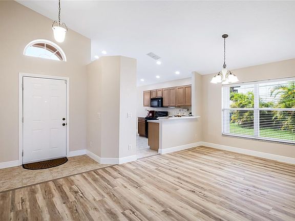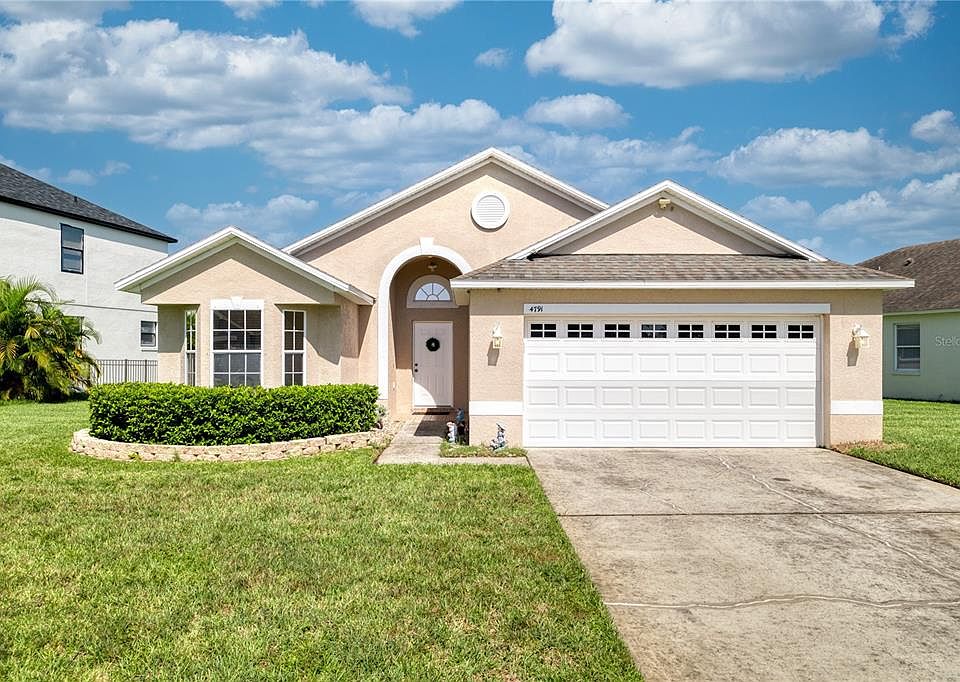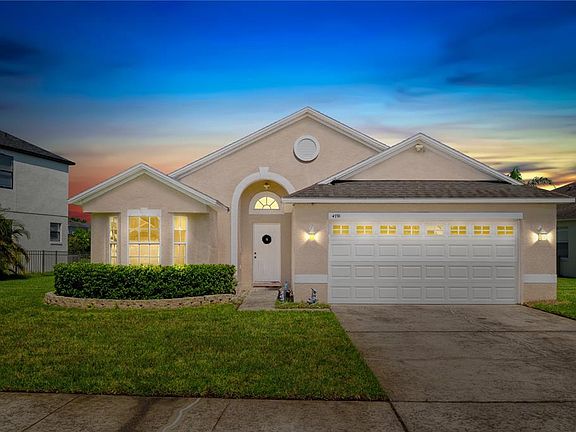 Beautifully maintained 4-bedroom, 2-bath, move-in ready home with a 2-car garage, situated on one of the largest lots in this sought-after community! This light and bright water-view home features an open split-bedroom floor plan with vaulted ceilings and stunning views that offer breathtaking sunsets. The spacious primary bedroom includes a large walk-in closet and plenty of natural light. The kitchen and bathrooms feature ceramic tile, while upgraded laminate flooring runs throughout the rest of the home, just 2 years old. The interior has been recently painted, giving the space a fresh and modern feel. Additional highlights include solid surface countertops, upgraded wood cabinets, hurricane shutters, and an eat-in kitchen. The community offers great amenities such as a pool and playground, and the home is ideally located near major highways, shopping, UCF, Lake Nona’s Medical City, and Orlando International Airport. Comfort, convenience, and scenic views come together to make this home a must-see!