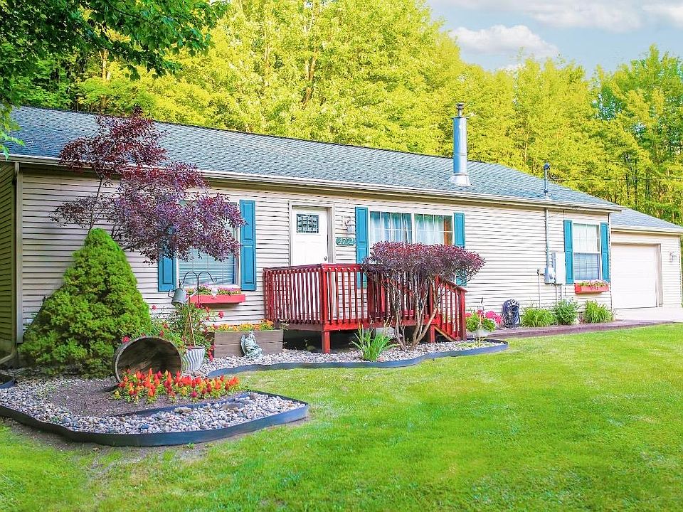 OPEN HOUSE Sunday 6/23 from 11:30am - 1:30pm Step into this wonderful open concept single level living 4 bedroom 2 bathroom home with a primary bedroom suite sitting on 2 acres, one of which is cleared and ready for many possibilities. Inside you will find a comfortable kitchen and dining space, main floor laundry, 4 good sized bedrooms, and a living room complete with patio doors, overlooking the backyard. Pellet stove in main living area helps keep utility costs low in the winter. The attached 2 car garage is a nice feature for storage or keeping your vehicles out of the elements. Additional storage shed in the back adds space for lawn equipment or other items you want to keep out of the garage. New gravel driveway, roof 2017, septic pumped Feb. 2024
