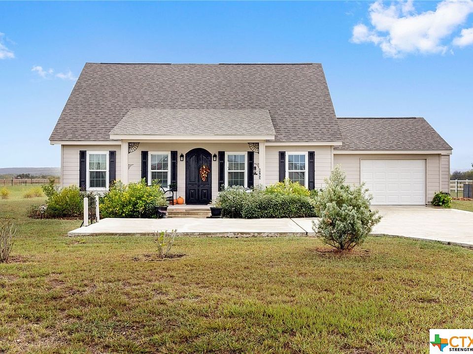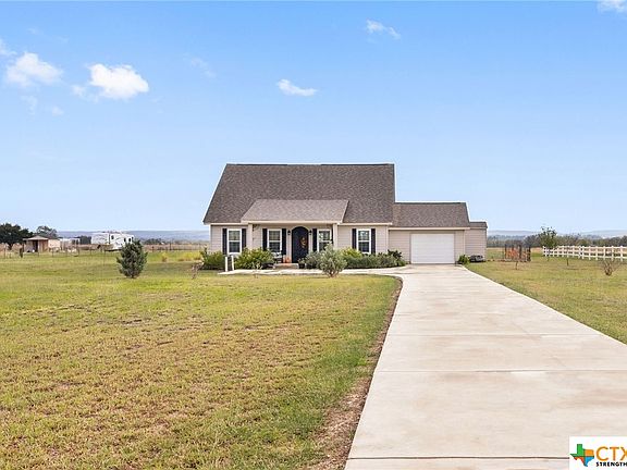 Country farmhouse on 3 acres with beautiful, rolling farmland views. Master bedroom/bath and 2nd bedroom with 1/2 bath downstairs. 3rd bedroom and office/studio upstairs with full bath. Concrete driveway. Greenhouse. Fenced dog yard with sturdy, all-weather doghouse. Trellises, vines, and flowering shrubs ad a cozy, private feel to the covered back porch. Open kitchen/living room design. Antique accents including front door and shutters. Plenty of room to build detached workshop to the east side of home. Aerobic septic. Energy Efficient Spray Foam Insulation. Extra storage under the stairs and in oversized garage. Navarro ISD. No restrictions! No HOA! Perfect for 4-H/FFA projects or adding a barn/workshop! Centrally located to San Marcos, New Braunfels, and Seguin!
