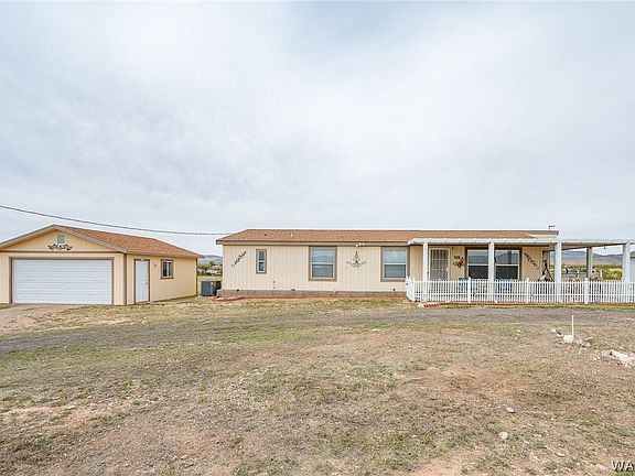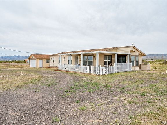 This 2008 Cavco home has been meticulously maintained and is ready for its new owners. It sits on a spacious 1.17-acre lot and features 3 bedrooms and 2 bathrooms. Outside, you'll find a circular driveway with two large RV-accessible gates, a roomy 2-car detached garage, and a charming covered patio that wraps around the side of the house and includes a sliding glass door to the kitchen. The entire property is fenced, with additional cross-fencing in the backyard to keep your furry friends close, and a large covered patio in the rear as well. Inside, you'll be greeted by a bright and airy living space with an open kitchen, formal dining area, and a breakfast nook off the kitchen. The primary bedroom is generously sized and includes a beautiful en-suite with dual sinks, a soaking tub, a separate shower, and a large walk-in closet. The water tank is located underground, and the area has easy water delivery service. This home is conveniently located just a few blocks from paved Estrella Rd. Don't miss out on the opportunity to make this beautiful property your own.