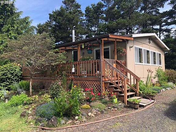 Hear the Ocean at this beach area 3 bedroom 2 bath well cared for mfg home. Open floor plan with living room, family room and dining room. Master bedroom has a walk in closet and a full bath. Come relax in this park like private yard with fruit trees, raised bed planters and beautiful flowering plants. Sit on the covered front porch and enjoy the beauty. Has a 2 car detached garage with workshop. Also has carport with access to back door entrance.