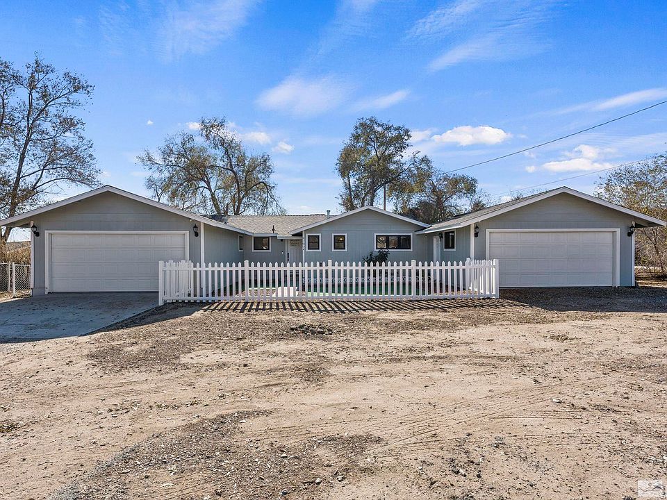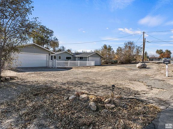 Usher in new beginnings on Nye Lane like it’s New Year’s Eve in this 1186-square-foot home with 3 bedrooms, 2 bathrooms, and two 2-car garages on 0.36 acres in Carson City. Throw a New Year’s Rockin’ Eve and toast the previously decorated primary bathroom updates, Andersen windows, floors, roof, and more. But first, make your NYE resolution to live on Nye Lane in 2024 and party like its 1999 upon acceptance of your highest offer with best terms. Don’t be late to act, otherwise party over, oops, out of time., Pull up and park 1 car, 2 car, 3 car, 4 in both attached garages or 5 car, 6 car, 7 car, RV, more on the driveways of the zeroscaped front yard. Or, from the curb, admire the appeal of the blue-gray exterior with white trim colorway and the enclosed courtyard with a classic white picket fence. See which courier rang the Ring while away, or glance through the front door’s decorative glass while home. Pick up packages placed underneath the protection of the covered porch and pass inside to the entry featuring a coat closet that also hosts the house’s smart hub. Make lifelong memories living in the family room. On a hot day, enjoy the cooling waft of the ceiling fan. Once removed, install again a stove and relish the radiating coziness on a cold day. Or, on an ambient day, balance the inside temperature with that outside by sliding open the slider. Cocina, cucina, kuchnia, keuken. An integral part of homes worldwide, the kitchen, no matter what name it is called in different languages, is universally understood as being the heart of the home. This kitchen beats with a 4-burner gas range and oven, refrigerator, dishwasher, and double-bowl sink with garbage disposal. It is said the way to the heart is through the stomach so, underneath chandelier light, enjoy favorite foods while creating fond memories with favored company gathered around a feastful table in the dining room. Down the hallway, open door after door after door. Privacy doors open to the primary suite, two bedrooms, and the shared bathroom, and interior doors open to the linen and utility closets. Pump cool air through the evaporative cooler air diffuser with a twist of the swamp cooler controller or fire up the furnace with a press of the thermostat. First and foremost, the primary bedroom commonly has a ceiling fan and, uncommonly, a door to the garage. Secondly and recently, the ensuite was remodeled and puts the “rest” in “restroom” with a refreshing walk-in shower and relaxing shower bench. Thirdly and conveniently, a spacious walk-in closet has sufficient space for stowing one or two’s wardrobe. The two remaining bedrooms can remain as bedrooms or be repurposed. Both rooms have ceiling fans and reach-in closets, and both share the hallway bathroom with a bathtub and shower combo. Launder linen in the separate laundry room, complete with 220v dryer connection, cabinets, hanging rod, and countertop. Park up to 4 cars in the two 2-car garages. The South garage is of the original construction and features an automatic garage door, 40-gallon water heater, and shelf and rafter storage. The North garage is a 1991 addition that has a double garage door in front and a single garage door in back, creating a drive-through to a concrete parking pad. This oversized garage is suitable for a shop with ample light, exhaust fans, 220v and 50-amp outlets, and utility sink. From the back yard’s uncovered paver patio, gaze west toward mountain views and watch the sunset glaze peak views. A perimeter fence contains this patio, but a meandering path leads to a gate accessing the remaining yard. ASSUMABLE LOAN OF ˜2.50%.