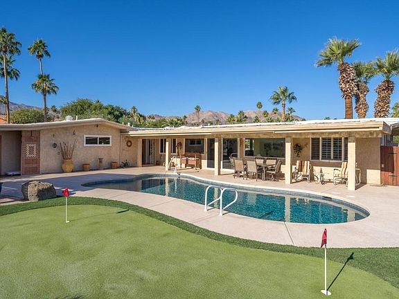 Presenting an exclusive opportunity in the highly coveted Silver Spur Ranch Community of South Palm Desert, renowned for its mid-century history. Situated on a generous corner lot, this property guarantees breathtaking 360-degree panoramic mountain views from the pinnacle of Sun Corral Trail. The outdoor haven features an expansive patio, solar heated saltwater pool, a putting green, and an outdoor shower. Ample space allows for basking in the desert sun or indulging in stargazing beneath the night sky by the gas-fired Chiminea. Indoors, you'll find two spacious bedrooms, two bathrooms, and a two-car garage with a separate workshop. An additional room currently exists as a craft/sewing room but can easily be converted to a large home office or a third bedroom. This home is beautiful as-is and has endless possibilities for additional indoor space. A short distance away lies El Paseo, Palm Desert's gem, offering exquisite shopping and dining experiences. The residence is also conveniently close to the popular Living Desert, Ironwood Park, and numerous hiking trails for exploration. Seller has partial ownership of a second alley easement/parcel and is currently exploring a Lot Line Adjustment. Unbelievably LOW HOA's make this the perfect desert retreat! The home will not last, so make an appointment to see it today - easy to show.