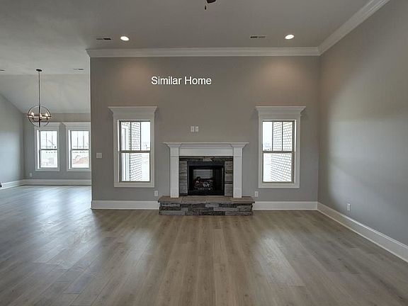 All brick Woodmont Plan A is an open floor plan with 3 car side entry garage and a large bonus up is backed by a 2-10 home warranty.. Home has 4 bedrooms and 3 baths. Home has wood plus flooring (Mohawk Revwood) in all living areas and bedrooms. Great Room features 12' ceiling, extensive trim, gas-log fireplace with upgraded fireplace treatment, wood Plus flooring, floor outlet, recessed lights and ceiling fan. Open Kitchen includes 12' ceiling, custom cabinetry with granite countertops, large island with extra storage and countertop seating, stainless appliances including dishwasher, gas cooktop, wall oven and wall microwave, tile backsplash, wood plus flooring, recessed lighting, and a pantry. Breakfast features 12' ceiling, wood plus flooring and extensive trim. Master bedroom has 11' double tray ceiling, wood plus flooring, extensive trim, recessed lighting and ceiling fan. Master bath has 11' ceilings, glamour tub, tile shower with rimless door, separate toilet area, double vanity and large walk-in closet. Oversized other bedrooms with 9' ceiling, wood plus flooring, crown molding and ceiling fan. The additional baths have 9' ceilings, tile flooring and granite countertops. Dropzone bench by door to garage. Wood stairs led to large upstairs bonus room which has wood plus flooring, crown molding and ceiling fan. Laundry has 9' ceiling, custom cabinet and tile flooring. Home has a covered back porch with ceiling fan. Home has a tankless water heater. Home includes a fully
