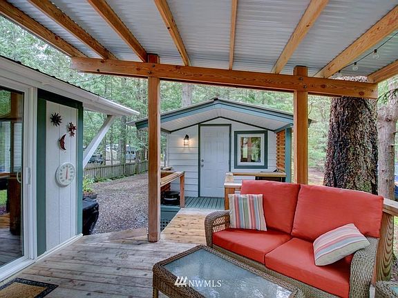 Step into this cozy and inviting Aljo to escape the stresses of life. There is plenty of room to lounge about from the covered porch to the bedroom. It's been tastefully designed inside and has lots of windows for maximum natural light. Outside, you'll find a path to the shed that has it's own little porch! Around the buildings, you'll see the phenomenal greenspace overlooking the Nooksack River below, and the mountains above. Sit at the overlook to admire the view, or around the campfire and enjoy your private get away. The Glen has all the amenities you could want, including 2 pools, hot tub, tennis court, library, laundry mat, 2 clubhouses, 24 hr security, gated entry, & play areas.