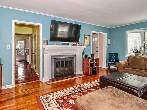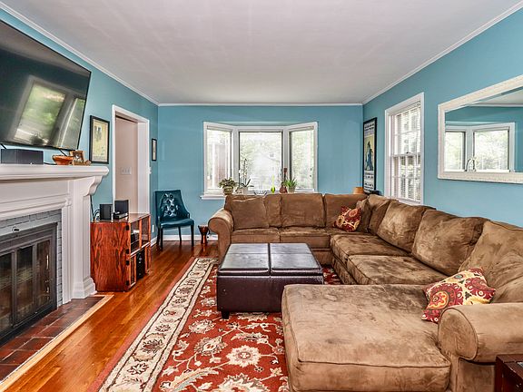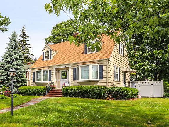 Charming well maintained cape code style home; Enter into spacious living room with wood burning fireplace and bay window; Large formal dining room with bay window; Updated kitchen with granite counters and cherry floors; Hardwood floors throughout; Office/study off living room; and full bath; Second floor features three bedrooms with nice light and main bath; Two zone heating; Partially finished basement with laundry area and workshop room; and utility area; Plenty of storage; Fully fenced yard with new paver patio; Near train line and shopping;