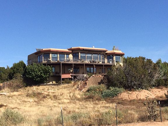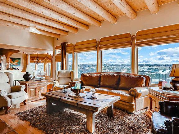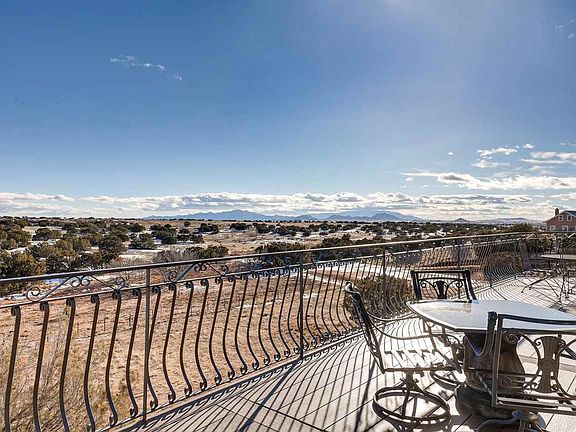 Feast your eyes on the ever changing 180 degree views throughout this spacious country home featuring 6' wrap around windows and expansive views of three local mountain ranges as you enjoy this gracious 4846 sq.ft. 4 bedroom 3.5 bath sitting on 5 ac. Multiple entertainment areas include wrap around decks, gourmet kitchen, formal dining and pool/game room with bar, sauna and wine storage. The lower level includes an apartment setup with private access and living suitable for older parents needing assistance or returning children. The outside amenities include fully landscaped and up lit gardens, extensive flagstone decking and walkways, horse facilities w/ pipe runs and fencing, finished tack room, covered hay storage and heated waterer, detached shop/garage, and deck mounted hot tub. The further enjoyment of this one of a kind property includes access to a 200+ ac open space excellent for horse back riding, hiking, and or mountain biking. The home is conveniently located within 15 min of downtown Santa Fe with freeway access to both north, south and west.