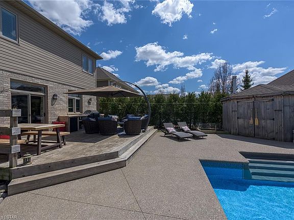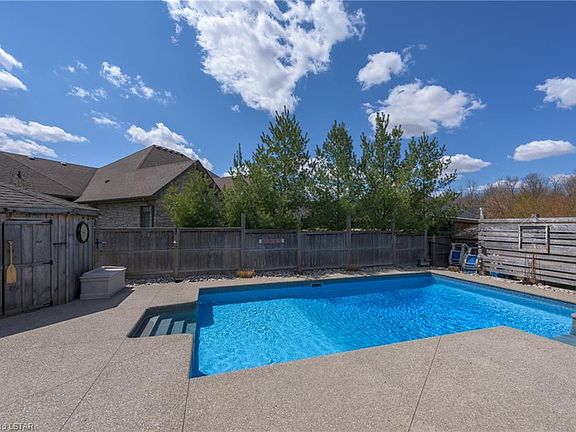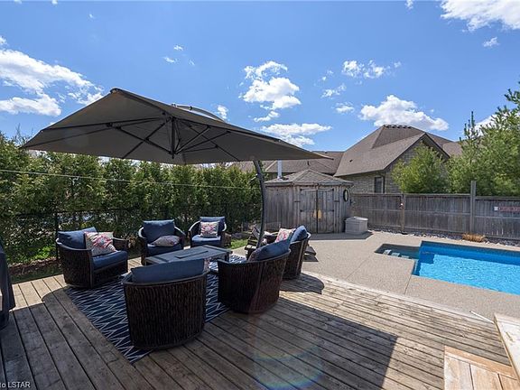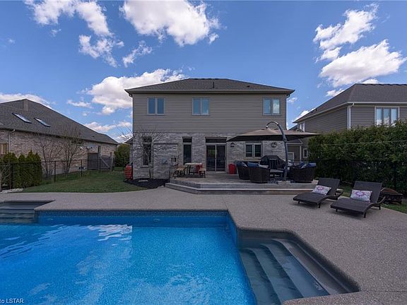 Beautiful Marquis-built two-storey home, on a great street, just minutes north of London! From the covered front porch, walk in to enjoy the 9' ceilings, crown mouldings, transom windows, and built-in speakers. The kitchen boasts loads of cupboards, large corner pantry and incredible 16' center island, great for preparing meals or entertaining and is open to the living room. Tray ceilings are a lovely feature of the front dining room. Upstairs, offers 4 spacious bedrooms, including a Master suite with a 5-piece ensuite and walk-in closet. The finished basement is home to a generous rec room, bathroom and an additional bedroom. The outdoor living space is an absolute oasis! A strikingly sleek, in-ground salt water pool is ready for lots of summer fun, or simply enjoy the 25'x14' deck in privacy. Get ready to move in an enjoy this wonderful turnkey home. *see all media links