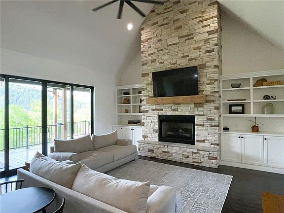 What a house! What a view! This all custom built home is perfection with 2 levels and most of the living on the main floor. Soaring ceilings and views will be the first thing you notice as you tour this home. The espresso wood floors, beautiful wrought iron hardware and fixtures and wall of windows with views of the lake and mountain vista give this retreat elegance and charm. The large entry way presents into an ample living room with open concept kitchen and absolutely beautiful sandstone stacked fireplace. Double glassed patio doors welcome the outdoors where you will spend the days relaxing and dining el fresco as this gem is equipped with an outdoor kitchen. The owners suite is surrounded by windows and has ensuite bath w/ hexagon tile, cobblestone shower accents and a free standing soaker tub. Upstairs is a large office(or 5th bedroom), where the views cant be beat! There is also another bedroom and full bath upstairs. You need to see this stunning home. Use it for a personal residence or a private getaway!