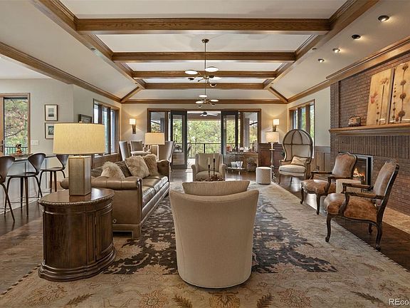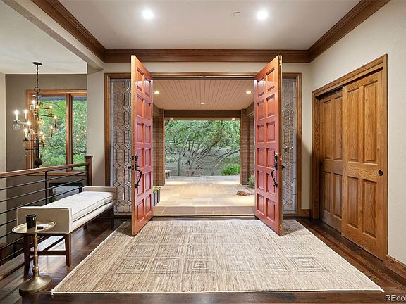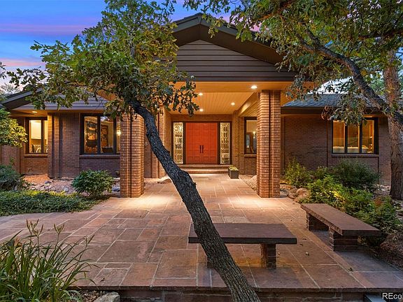Welcome to this Frank Lloyd Wright-inspired masterpiece on nearly 2 acres in the prestigious Village at Castle Pines. The exterior grounds are an entertainer's paradise, featuring a beautiful lily pond and water feature that provide a tranquil ambiance. The multi-tiered hardscape includes a built-in Viking grill and fire pit, perfect for hosting intimate and large groups. Multiple gathering spaces offer endless opportunities for outdoor enjoyment. A backdrop of majestic Ponderosa Pines ensure complete privacy. Inside, the spacious rooms and great flow of the home make it ideal for relaxation and entertaining. The fully updated kitchen boasts top-of-the-line Miele appliances, a Cambria Quartz island, and ample storage. It opens into the great room, anchored by a cozy brick fireplace, extending to an expansive covered deck that blends indoor and outdoor living. The formal dining room features coffered ceilings and a window framing Frank Lloyd Wright’s "Contemplative Sprite" statue in the courtyard. The main floor primary suite is a sanctuary with its own fireplace, private deck access, and luxurious bath with heated floors, double vanities, a soaking tub and a remote-controlled shower. The suite also includes a large walk-in closet and connects to the den/library, adorned with rich wood paneling and built-in shelving. A fully remodeled half bath and laundry room complete the main floor. Descend the redesigned staircase to the walk-out lower level, featuring high ceilings and a large entertainment space with a full bar and fireplace. This level includes three secondary bedrooms, a shared full bath and ¾ bath. Additionally, a 900+/- bottle wine room and a private office/flex space provide extra luxury and functionality. Double doors lead to a covered flagstone patio, providing easy access to the magnificent backyard. This extraordinary property combines the best of transitional architectural elegance and natural beauty, creating a unique living experience.