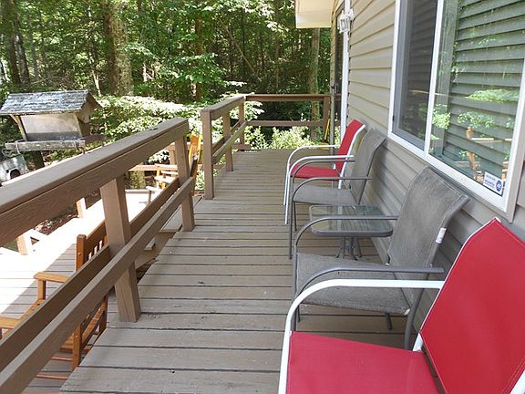 Very tranquil setting for this 2 bedroom 1 bath home. Nestled in the woods with privacy. Beautiful Brazilian cherry floors thoughout the home. Bright updated kitchen with great counters and large picture window. Separate area for kitchen table and sitting area with charming rock wall for wood burning stove. Master bedroom with ample closets. Nice updated bathroom. Loft area upstairs which could be used for study or third bedroom. Skylight in loft for natural sunlight. This home has insulated windows. Deck updated around 2 sides for rocking chairs, relaxing and family cookouts. There is a part/basement for storage and possible small workshop. Cozy living room for family time. Home is equipped with refrigerator, stove, dishwasher, microwave. Heat pump/cool and Gas furnace/heat.