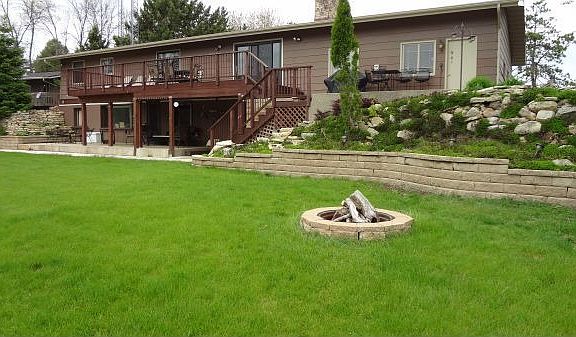 107 feet of lakefront on Lake Zumbro with gorgeous views of the hills from this 4 bedroom + den rambler. Blacktop roads take you to the large flat yard. A large deck and aggregate patio off the main level leads are the perfect spot to entertain. Or sit at the patio off the walkout to watch your guests play bean bag toss or shuffleboard. The large kitchen hosts both a range and built-in oven with a snack bar. From the formal dining area, look out the patio door to enjoy the view of the bay. In the cooler seasons, enjoy the stone fireplace in the spacious lower level. The house has 1 and 1/2 baths up and 3/4 bath down. A shop sits behind the garage. Property is not in floodplain.