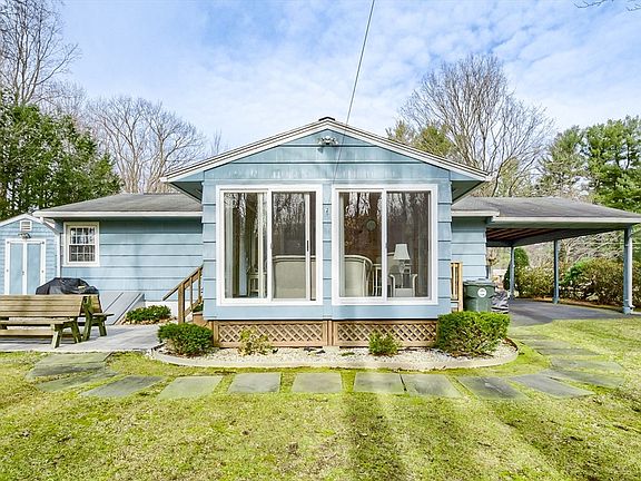 Offer deadline - Monday, March 18th 4 pm. Great neighborhood setting and location for this ranch style home. Enter the spacious kitchen/dining area with light cabinetry and Corion countertops, tile flooring. A beautiful 3 season sunroom approx. 200 sq. ft. with wood cathedral ceiling and sliders - a great place to enjoy nature, reading, playing games or meals in the warmer weather. Light filled living room with a big picture window. Three bedrooms on the 1st floor - all with closets. Downstairs has a bonus room and full bath - a great guest area. Also, a finished area for exercise, hobbies or playroom. Separate utility room. Updated vinyl windows. Attached carport - town water and sewer, storage shed. Partial fenced in yard. Overlooks the Asnebumskit Brook.