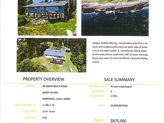 This 964 square foot single family home has 3 bedrooms and 1.0 bathrooms. This home is located at 48 Cedar Beach Rd, Harpswell, ME 04079.