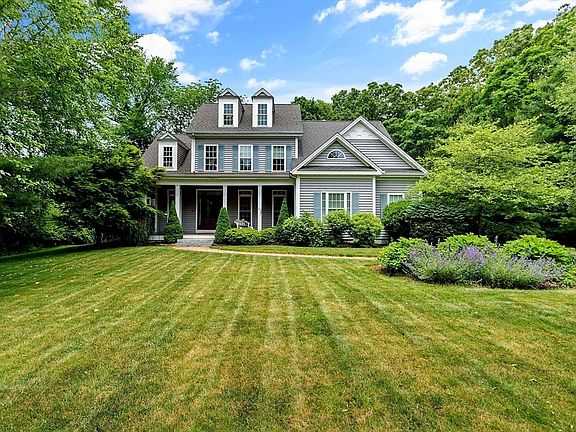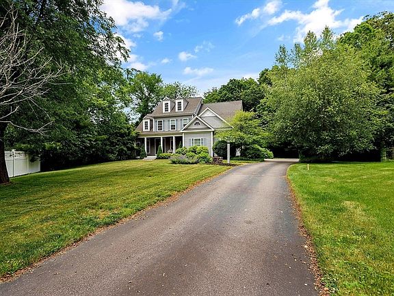 Discover this exceptional Colonial home located at the end of a sought-after cul-de-sac. The charming farmer's porch welcomes you into a foyer with a soaring 2-story ceiling and gleaming hardwood floors throughout. The floor plan is an entertainer’s dream with upscale finishes and architectural details designed for modern entertaining. High-end appliances including a Wolf double oven, Thermador gas cooktop, pot filler, warming drawer, and Sub-Zero refrigerator. Custom cabinetry with soapstone countertops. Expansive Family Room: Cathedral ceiling, gas fireplace, and elegant oversized windows. Luxurious primary suite: Coffered ceiling, sitting area with French doors leading to deck. spa-like master bath with tiled walk-in shower, Jacuzzi tub, double sinks, and custom California Closet system. Remarkable additional living space with many extra amenities inc built-in refrigerator and an additional bathroom plus ample extra storage. Brand new Generac whole house generator!
