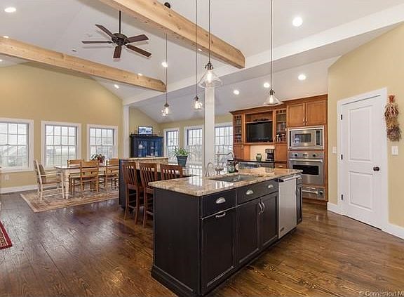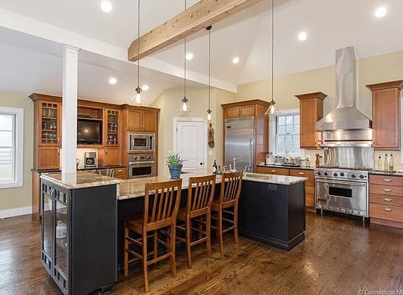 Hitchcock Farm is a magnificent 6.4 acre horse farm located less than six miles from Yale University and 0.7 mile to Woodbridge Town Center. Initially built in 1860, the home was completely rebuilt in 2010 and is move-in ready with new windows, new furnaces & central air units, new roof, new siding, new insulation, new plumbing, etc. The home features 3 BRs/3.1 BAs & 2801 sq ft and southern yellow pine floors throughout. The large kitchen is every chef's dream with a cathedral ceiling, wood beams and a T-shaped center island with a granite top. Lined w/windows for beautiful farm views, the kitchen is equipped with professional-grade Viking appliances that include a stainless steel refrigerator and separate freezer, gas range/oven, stainless steel hood, dishwasher, microwave, convection oven, beverage center (wine chiller, mini-fridge & ice maker), and warming drawer. The space leads to a comfortable and relaxing family room which leads to a spacious Master Bedroom which has a large walk-in closet and its own bathroom with marble flooring and counters and separate jetted tub and shower. The 2nd floor has two other bedrooms (each with its own bathroom), a common area and an office. The 3rd floor has a widow's walk.The property is subject to a conservation easement which prohibits sub-division. The property has 3 paddocks, 2 run-in sheds (12X20) and 2 Kloter Farm sheds (10x20 & 12x14). A covered porch is off the rear of the home.