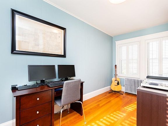 Move in ready, first floor condo located in prime West Medford location! Generous size living room with wood burning fireplace offers access to heated sun room, perfect for office or playroom. Large, formal dining room with built in china cabinet. Bright, white renovated kitchen with granite counters, gas cooking and abundant cabinetry. Private laundry just off kitchen.Both bedrooms offer spacious closets. Gleaming hardwoods and crown molding throughout! Private back porch, shared yard and plenty of storage in basement. One off-street tandem parking spot. Newer systems and windows. Blown-in insulation. Walking distance to West Medford Square, Commuter Rail (1 stop to North Station), multiple bus lines (including 95 and 326 bus stop at the end of the street) and Playstead Park.