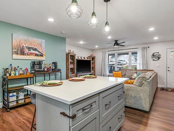 • Kitchen/Dining Room Combo, Open Floorplan, Kitchen Island, Eat-in Kitchen, Solid Surface Countertop(s)