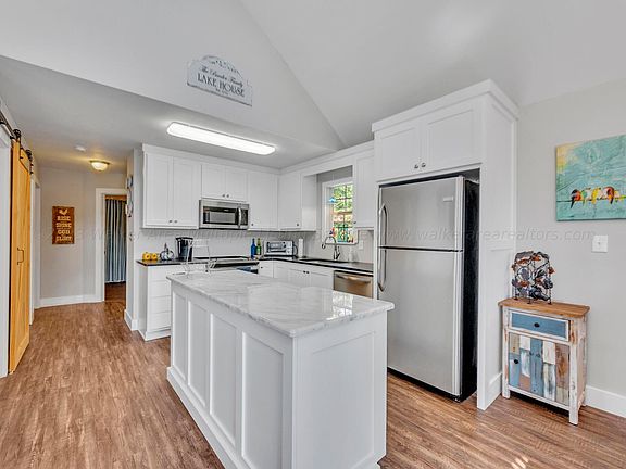 This FULLY FURNISHED 3 BR/1.5 BA cottage sits on a 1.68 acres of wooded privacy. 2 story dock sits on deep year round water with 165 feet of shoreline. Features vaulted ceilings , renovated kitchen with granite countertops. Open kit/living/dining with a covered porch lakeside.