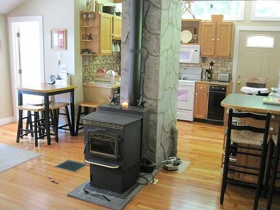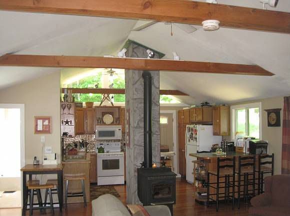 Cute as can be, immaculate, OPEN CONCEPT Ranch, sited nicely on a knoll, w/a little view. Dramatic, cathedral ceilings throughout this home, complimented w/open beams, central FIELDSTONE chimney w/2 flues, octagon & triangle windows & a pellet stove, that completely heats the home. KIT is well equipped, w/lots of oak cabinets, nice built-in breakfast bar/work island & new door to the new 16x16 pressure treated deck, perfect for your grilling convenience. Plenty of light & a greatroom style LR & Dining area combine for easy living. MBDR w/skylights & windows on 3 sides. Impressive updating & recent improvements include: new roof, new Harvey replacement windows, new septic system, newly sanded floors, newly painted interior, new 100 AMP CB & new exterior doors. Just minutes to downtown Keene