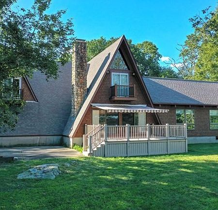 NEW PRICE!!! WATERFRONT ON DEVOL POND! Privacy, peacefulness and tranquility abound on this 5+ Acre waterfront site! The unique A-Frame style home combines a state of the art kitchen boasting Quartz counters, custom cabinets, Viking stove and double wall ovens, and features a breakfast bar and adjacent dining room. The family room enjoys a wood stove and Cathedral ceilings with sliders leading to the composite deck overlooking Devol Pond. The formal living room also has a fireplace, and the first floor bedroom and den enjoy water views. The first floor bathroom holds a Jacuzzi tub and a separate shower. The second floor hosts two more bedrooms and another full bathroom with a tub/shower. The attached two car garage has workspace and room for storage, and the full basement has a finished rec room. Amenities include a generator, central air conditioning, propane, deck awning, recent roof (2017) and kitchen addition (2017). Truly a beautiful property.