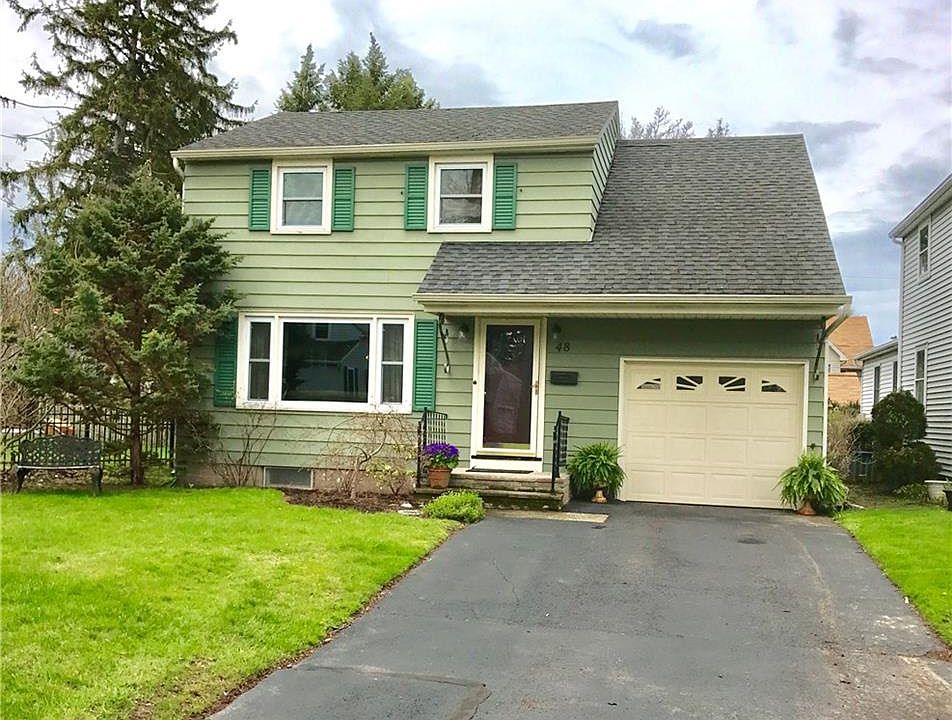 Meticulously maintained 3 bedroom colonial on a quiet street in West Irondequoit! This home features hardwood floors, updated Formica kitchen counters, and a custom 3-sided gas fireplace that you'll enjoy from the living room and dining room! There are hardwood floors in all 3 nicely sized bedrooms with plenty of closet space. You will love the enclosed porch off of the dining room that overlooks the gorgeous fully-fenced private backyard and park-like setting with included pergola and swing. Newer thermopane windows throughout, all newer appliances are included. This one will not last, call today to see your new home!