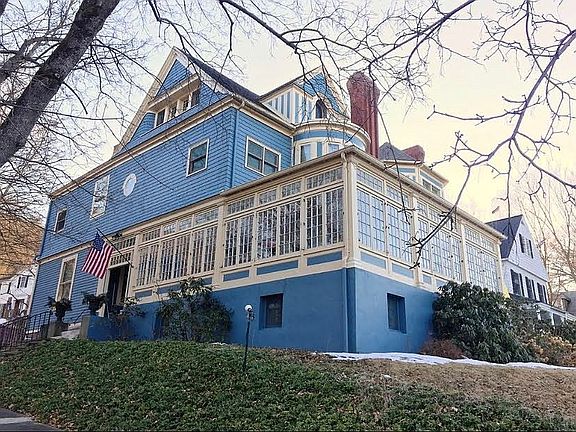 Queen Anne Victorian built in 1892 by local real estate magnet, Marvin Olcott (architect Tuthill / builder English). The house was enlarged and renovated during various eras. The southeast corner of the house extended from 1903 to 1908. Sometime after 1948, the wrap-around enclosed glass porch was added. The house has been modernized including a central HVAC system, humidity control, modern wiring and plumbing, kitchen, bathrooms, and converted gas fireplaces. Many early features remain including solid wood floors, ornate fireplace mantles, intricate doors and fixtures, servants' quarters, and a butler's pantry.