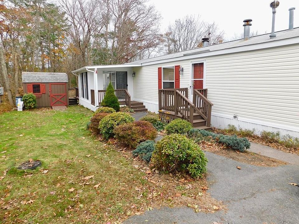 SINGLE FAMILY HOME for half the price...This Fantastic Mobile home is in a private area backing up to a wooded lot, With a Wood Burning Fireplace this will surely keep you warm this Winter! Brand NEW Laminate floors within the past year. New Hot Water tank. Newer roof ( not sure the age) The Eat in kitchen is warm and cozy with plenty of cabinets for storage. Center island for add'l cooking space and storage. All Cabinets and Wood 6 panel Doors refinished to its original luster, French doors lead out to a 3 season porch which is perfect for those Summer nights. Utility Shed on premise recently painted along with all decks. Close to highways, schools, & shopping. Great Unit worth every penny!