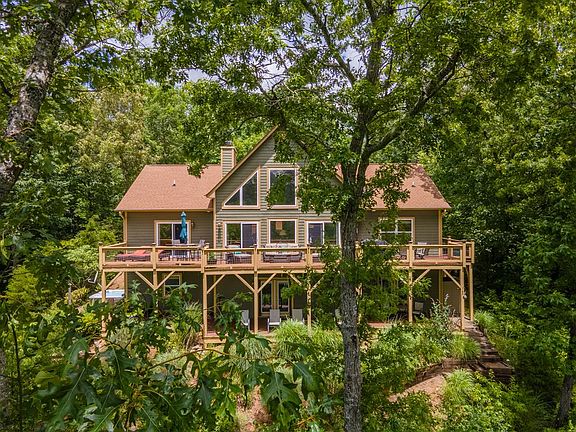 Magnificient 3BR/3BA mountain home with bonus rooms. Over 3700 sq ft. of living on well-maintained gravel road - 2 acres in private, small community in Cartoogechaye. Main level open floor plan with large kitchen & large granite island everyone gathers at with an adjoing dining area, great room w/stacked stone wood burning Fireplace & wall-to-ceiling windows with 2 sets of sliding glass doors lead to the decks to see amazing mountain views. Front patio has fire pit for enjoying evenings with friends and family and a rock water fountain. Main bedroom has been updated en-suite bath with large walk in tiled shower, his and her vanities, guest bedroom and full bath w/tub shower, study/office on main level, mudroom/laundry. Basement has game room equipped with poker & pool tables, movie theater, library, bedroom with doors to outside deck, full bath that has a walk in shower and a large craft room area with lots of natural light. 2 levels of furnished decks to enjoy the mountain sunrise and plenty of room for entertainment. Large hot tub outside to enjoy sunsets w/privacy. Workshop/storage shed is steps away from the house. This is mountain living at its best!