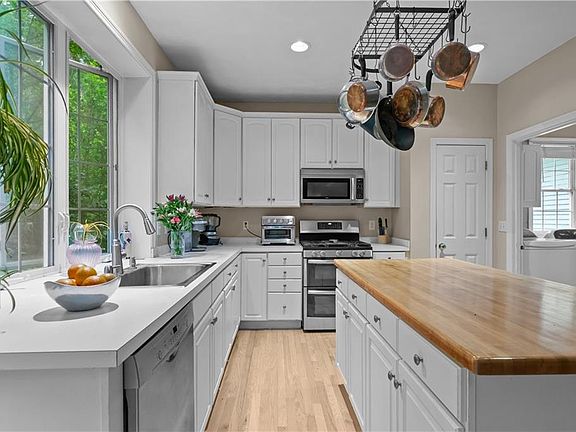Butcher block islandFinished lower levelColorful perennial garden pathDining roomSpacious light-filled layoutStainless steel appliances